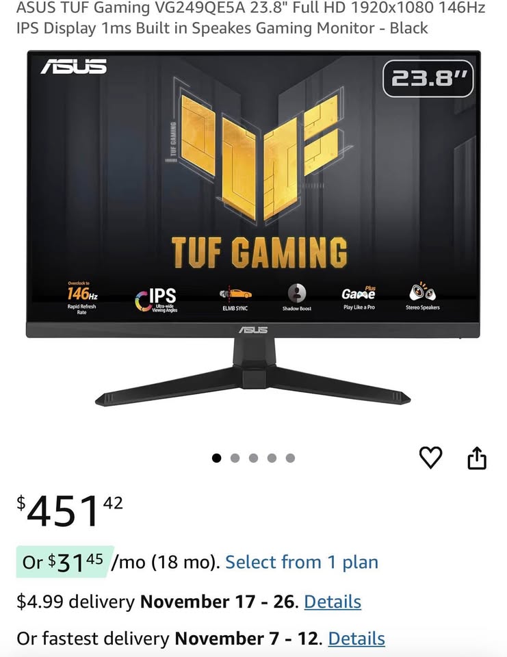 ASUS 23.8” Full HD Gaming Monitor – 1080p, 146Hz (OC) Refresh Rate Designed for smooth, immersive...