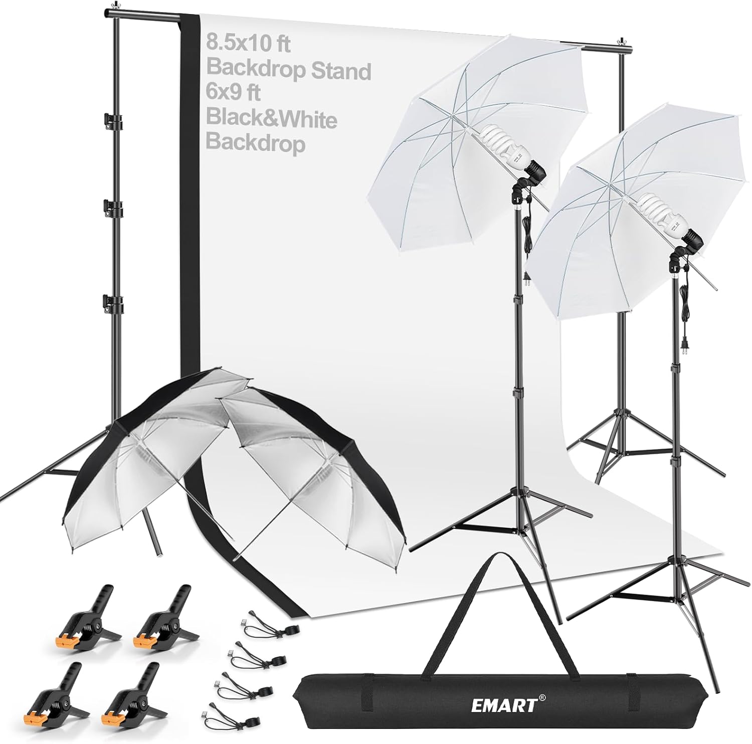 Portable photography backdrop kit with adjustable aluminum stand, umbrella light, and black/white muslin backgrounds. The backdrop...