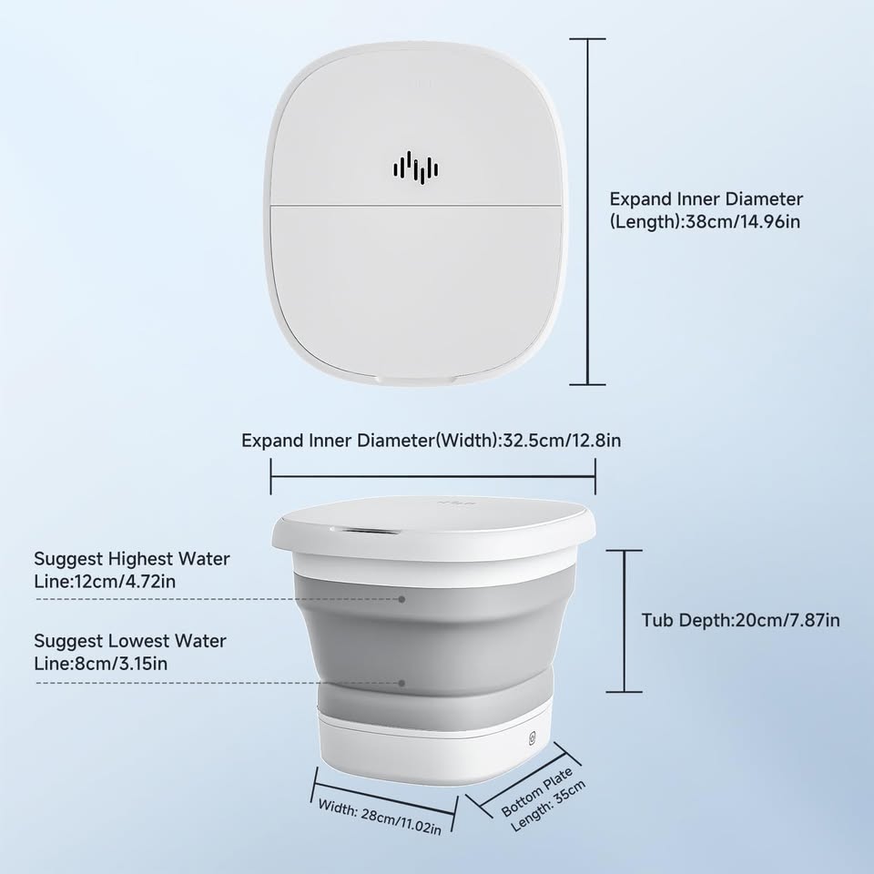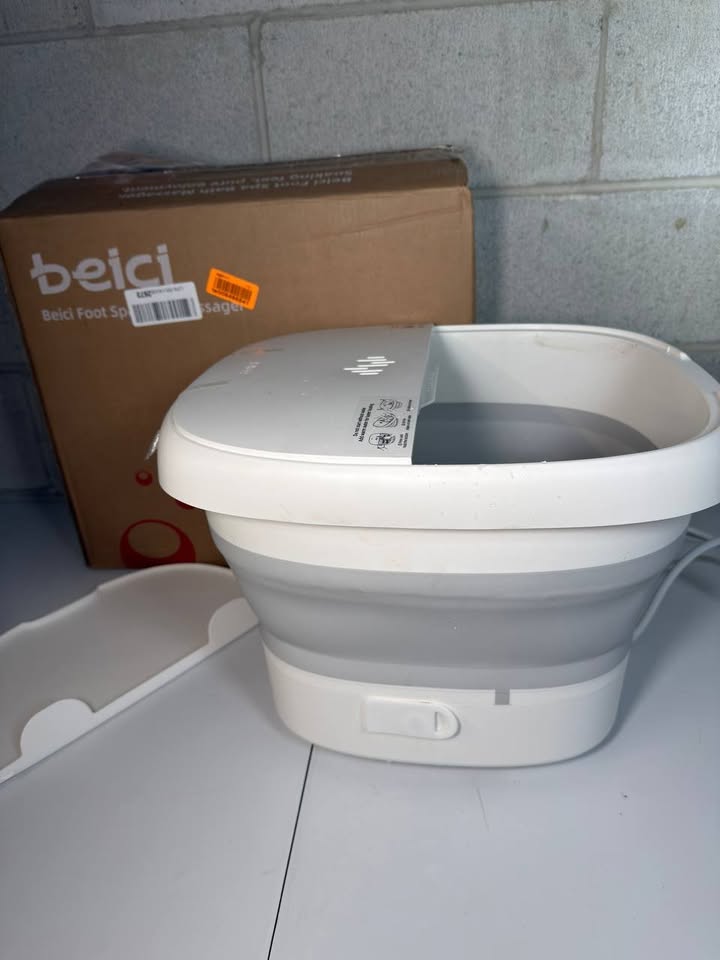 beici Foldable Electric Foot Spa – Red, 800W Corded electric foot spa with PTC heating, 4 massage balls, shiatsu plates, bubble jets, and adjustable temperature (104–111°F) with 60-minute timer. Foldable design with cord storage for easy portability. Dimensions: 42.1 x 37.1 x 15.7 cm.