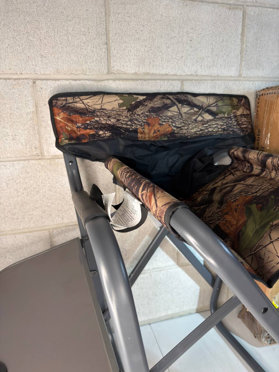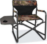 Lightweight foldable camping chair with solid back, fabric seat, aluminum frame, and built-in side table. Camo design blends into outdoor settings. Supports up to 300 lbs and packs compactly for easy transport. Ideal for camping, fishing, tailgating, or backyard relaxation.