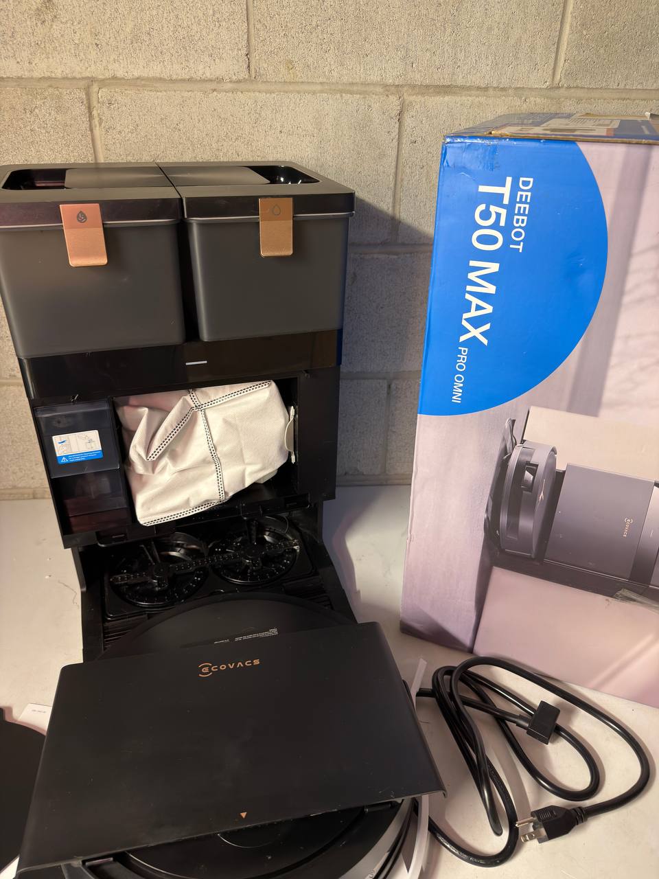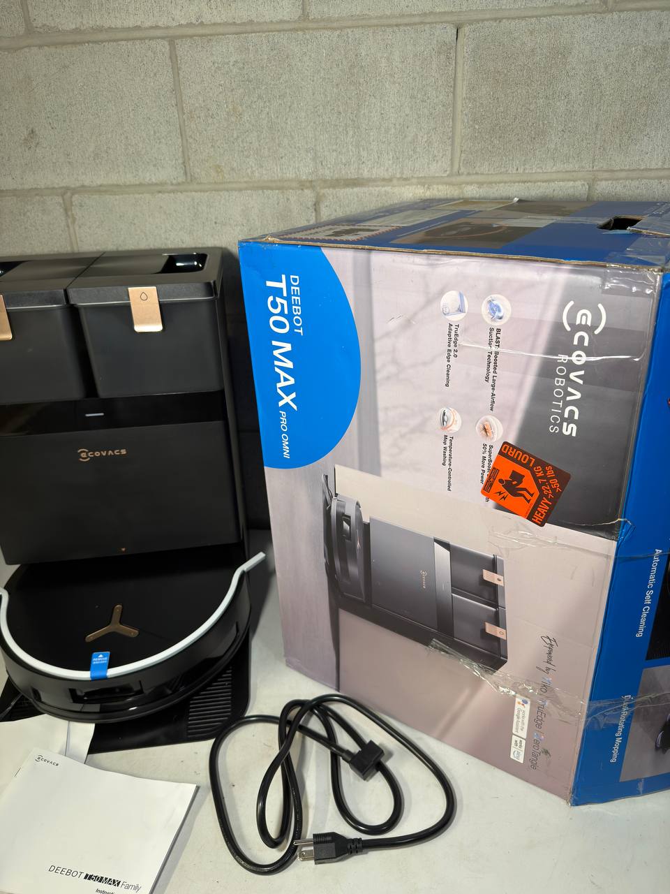 A premium all-in-one robot vacuum and mop built for deep cleaning homes with pets, carpets, and hard floors. The ECOVACS T50 Max Pro Omni delivers massive 18,500Pa suction, ZeroTangle technology to reduce hair wrap, and an auto-lift mop that keeps carpets dry. Its 12-in-1 OMNI Station handles mop washing, hot-air drying, self-emptying, and refilling for fully hands-free maintenance. With advanced obstacle avoidance, precise LiDAR mapping, and voice/app control, it offers powerful, automated whole-home cleaning in a sleek design.