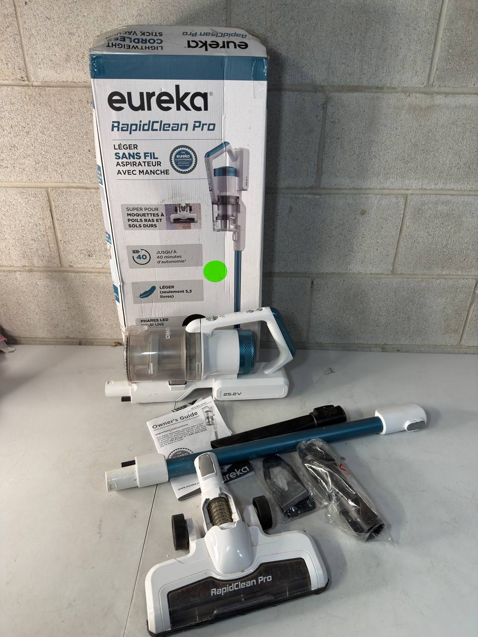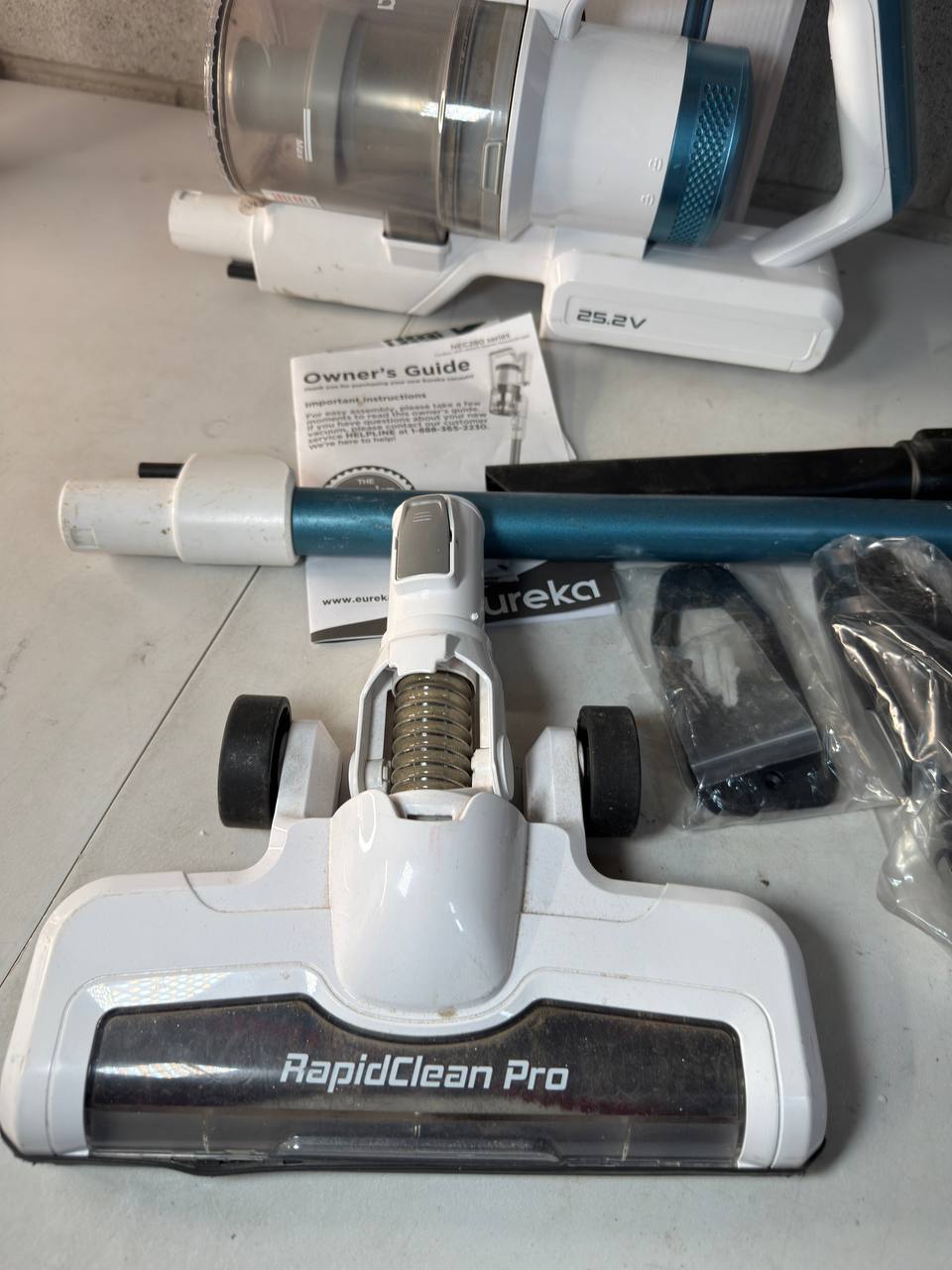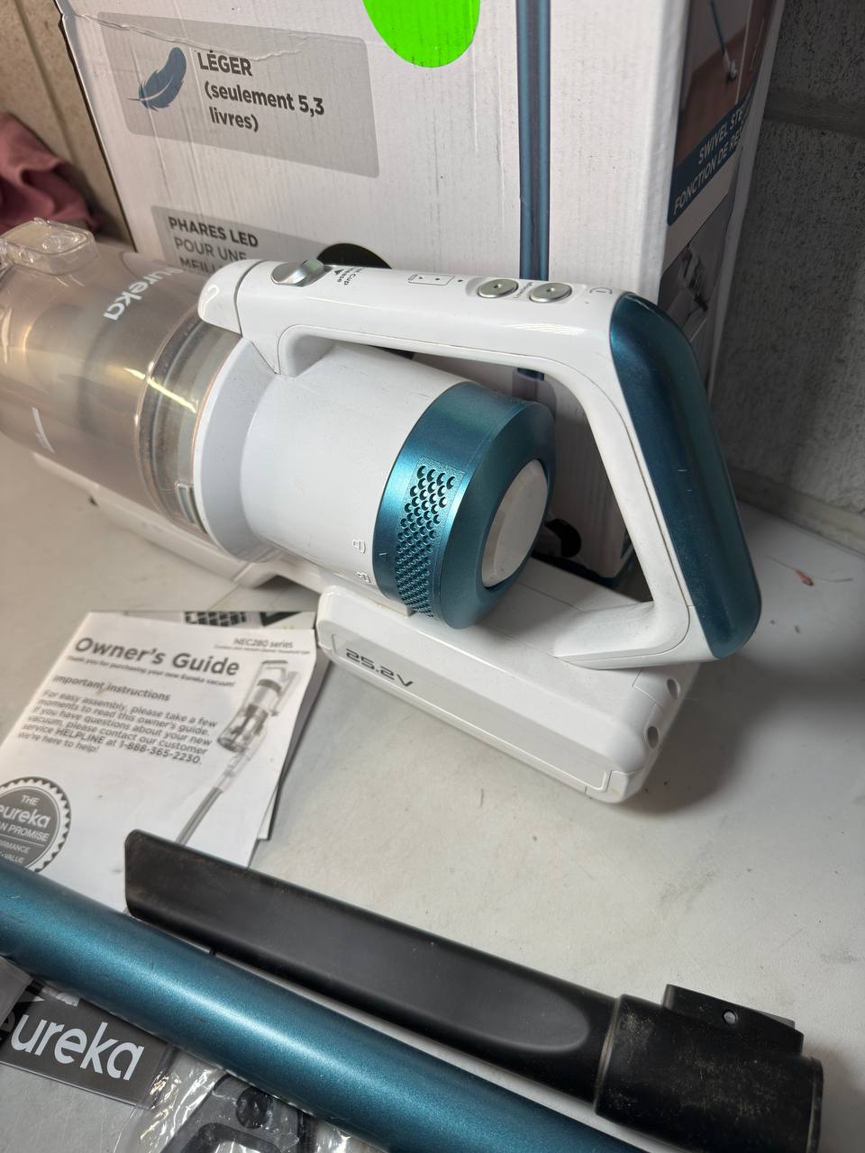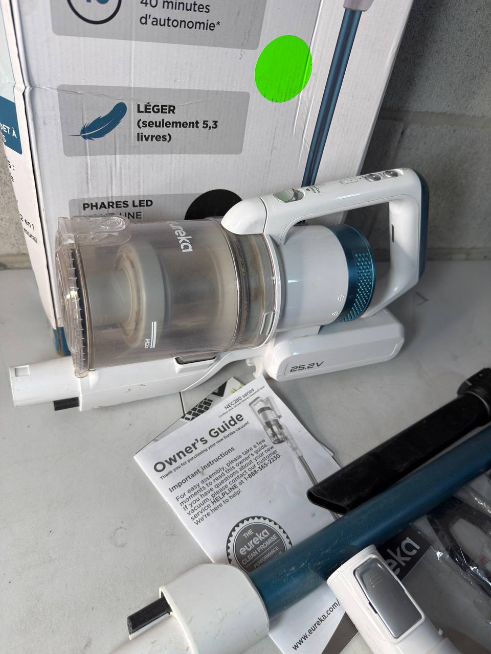 Eureka NEC280TLC cordless stick vacuum delivers 250W of brushless digital motor power with 240% stronger suction for efficient cleaning on carpets and hard-to-reach areas. Features a 40-minute runtime, 5-stage filtration system, 3 adjustable power modes, and LED headlight brush for precision cleaning. Lightweight and maneuverable with Easy Rest design for quick breaks and effortless under-furniture cleaning.