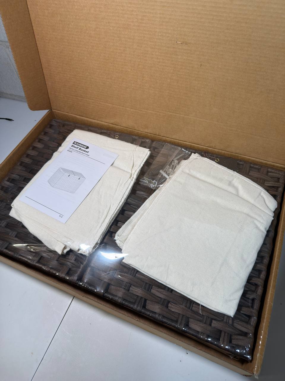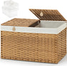 KUREEISE 105L Rattan Storage Basket Stylish 64 x 39.1 x 40.9 cm handwoven rattan storage basket with a 105L capacity and dual flip-top lids for organized storage. Features two removable cotton liners, sturdy iron frame supporting up to 55 lbs, and leather side handles for easy carrying. Waterproof and breathable design—perfect for storing clothes, blankets, or toys in any modern home.