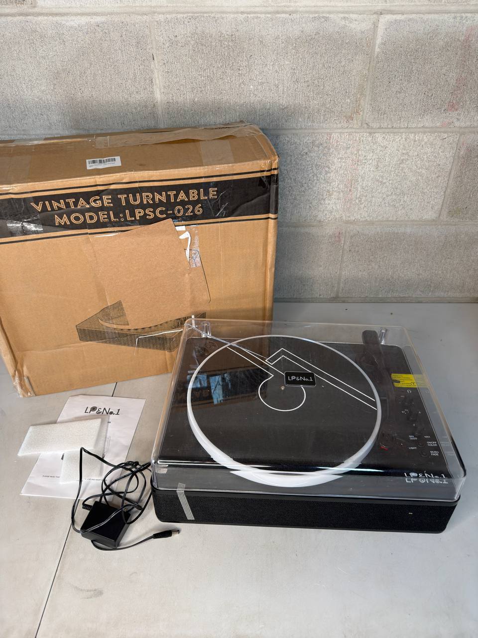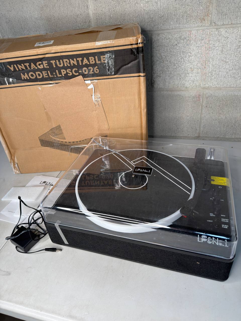 • Included: Turntable unit, removable dust cover (cracked), power adapter, 45 RPM adapter, USB cable, user manual, and original accessories (see photos)