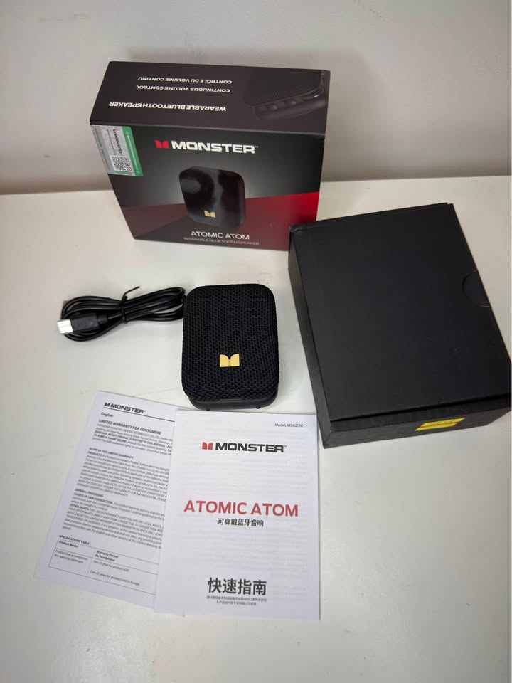Monster Atomic Atom Wearable Bluetooth Speaker – Compact, Powerful, Waterproof Experience Pure Monster Sound with deep bass and clear highs from the 33mm dynamic driver wrapped in a premium dual-material mesh for superior sound projection. This lightweight 81g clip-on speaker attaches easily to your clothes or bag—perfect for travel, workouts, or outdoor adventures.