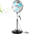 A heavy-duty cooling fan built for patios, gardens, factories, and outdoor spaces. Its 16" misting kit with 4 nozzles delivers cooler, cleaner airflow while the 20" fan pushes up to 4650 CFM. Made with a rust-proof steel frame, aluminum blades, and a stable base with wheels, it offers adjustable height, 360° tilt, and three fan speeds. The waterproof dual ball-bearing motor ensures long-lasting performance indoors or outdoors.