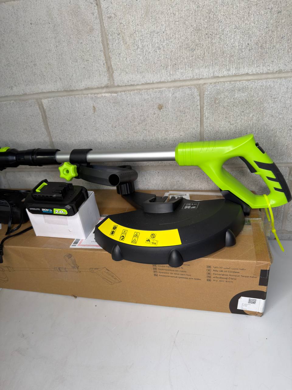 2-in-1 grass trimmer and edger with 12" cutting width. Lightweight (3.75 lbs) with 21V 2.0Ah battery offering 30 mins runtime. Adjustable head and handle for precise trimming. Auto-feed line system included.