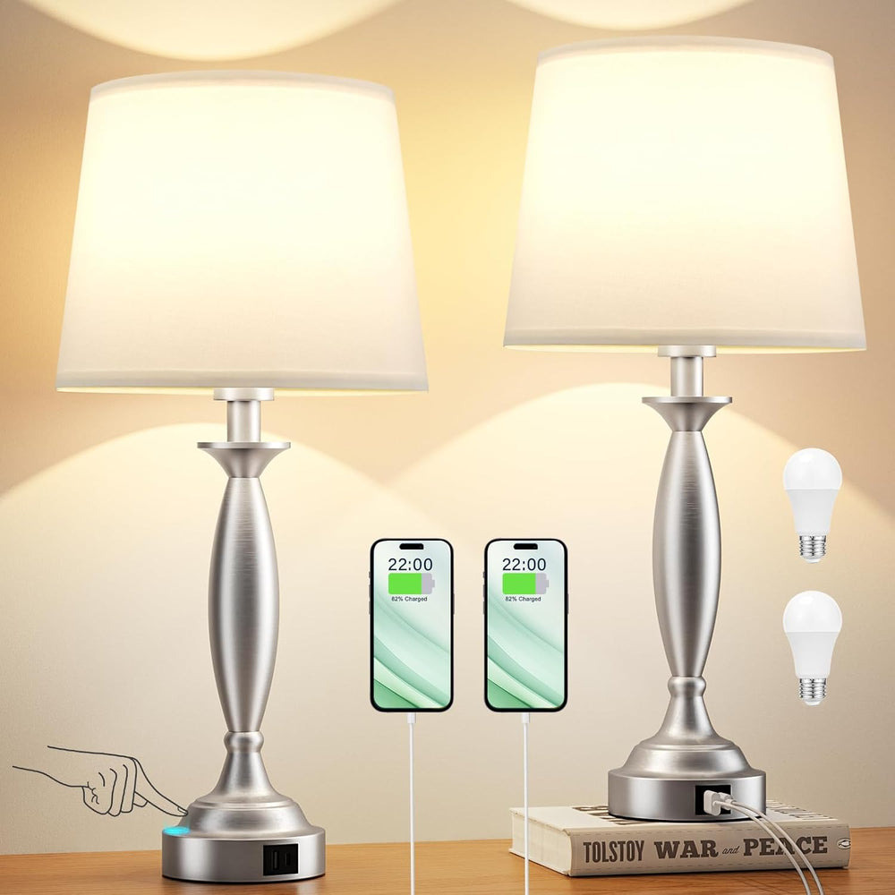 This Touch Lamps for Bedrooms Set of 2 combines modern convenience with stylish bedside lighting, making it ideal for bedrooms, living rooms, or nightstands. Each lamp features touch control operation with 3-way dimmable brightness, allowing you to easily adjust lighting levels for reading, relaxing, or nighttime use. Built-in USB-C and USB-A charging ports let you power phones and devices directly from the lamp base, reducing cable clutter. This set is brand-new in box (BNIB) and includes energy-efficient LED bulbs for immediate use.